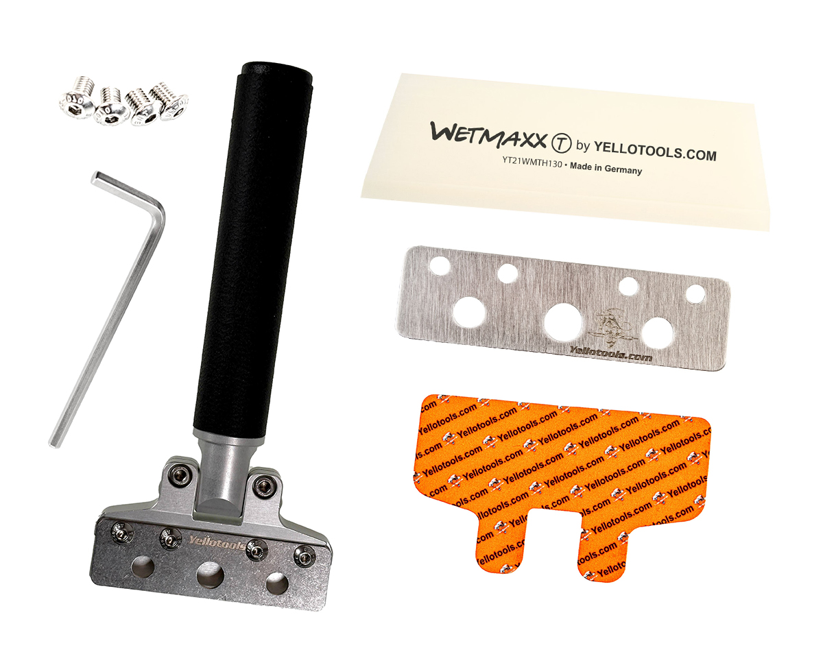 ※同梱の金属プレートはスキージー固定用で使用、イエローツールズ柄のパッドはガラスへのキズ防止用でハンドルの裏側に貼り付けます。