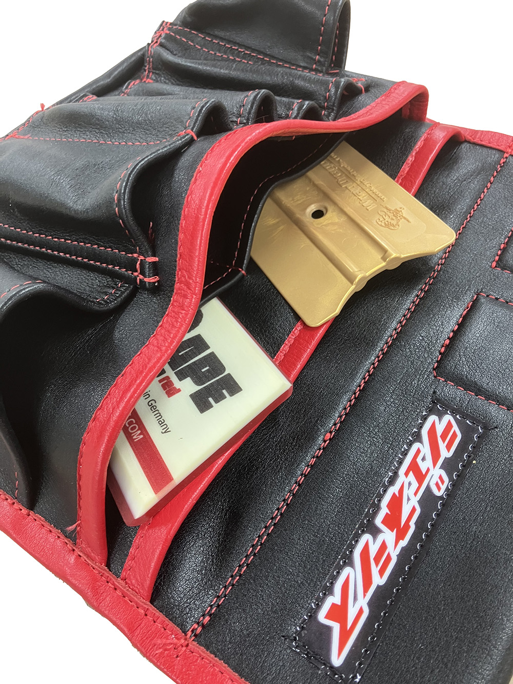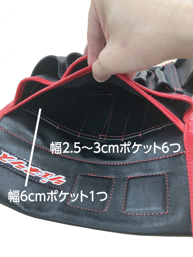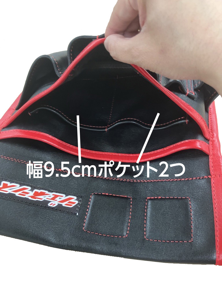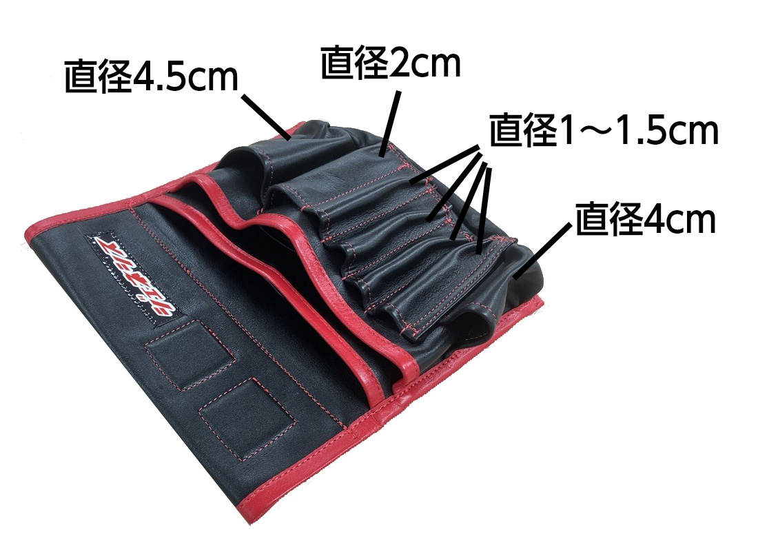 表側に縦長のポケットが並んでいるので、スティック状のツールを使いこなす方に便利です。